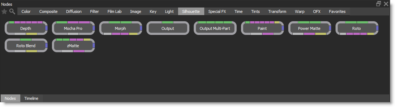 Silhouette is a node based system and different nodes are used for various functions. Located in the Nodes tab at the bottom of the screen, nodes are grouped into various categories.