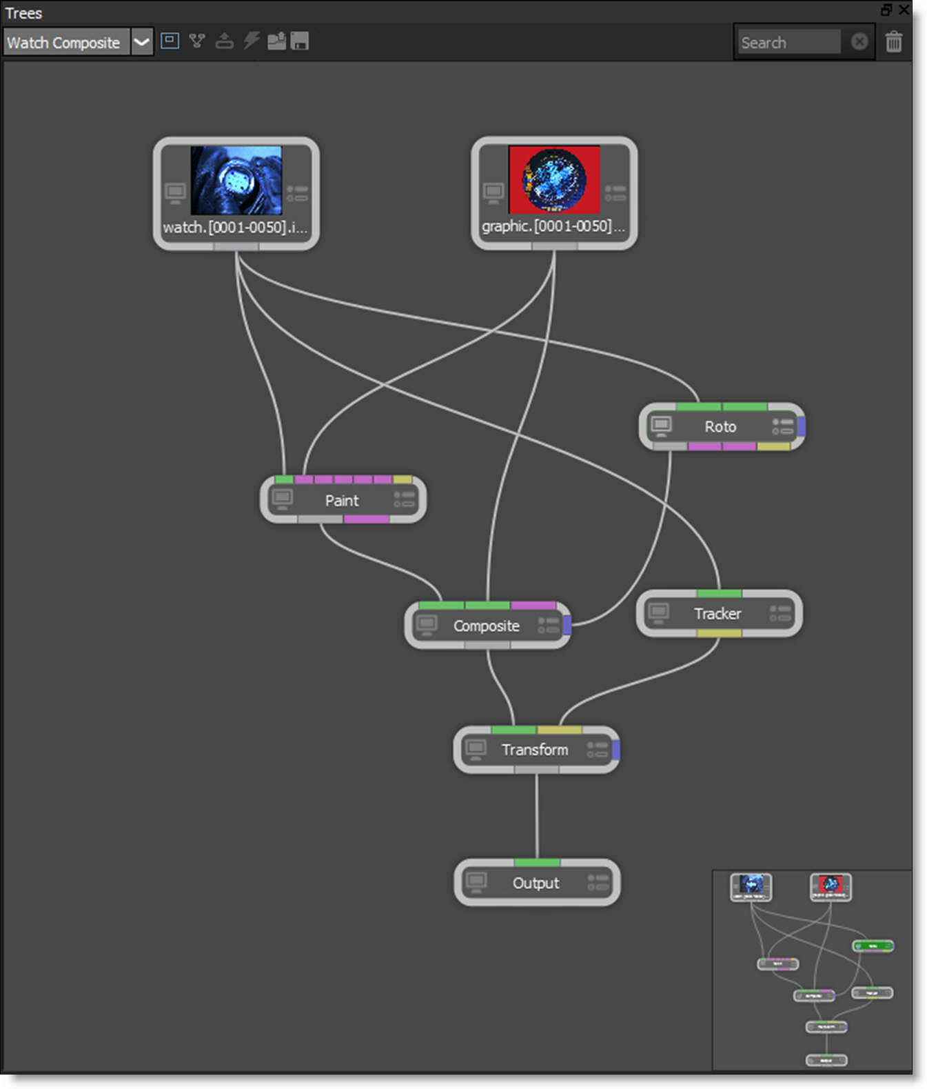 The power of Silhouette lies in the Trees window where your effects are built. A tree is a series of clips and nodes, such as color correction, image processing and composite nodes, plugged together to create the desired effect. The tree is grown by adding clips and nodes in any order. The ability to view any node while editing another allows for very complex composites that can be set up and rendered in one pass.
