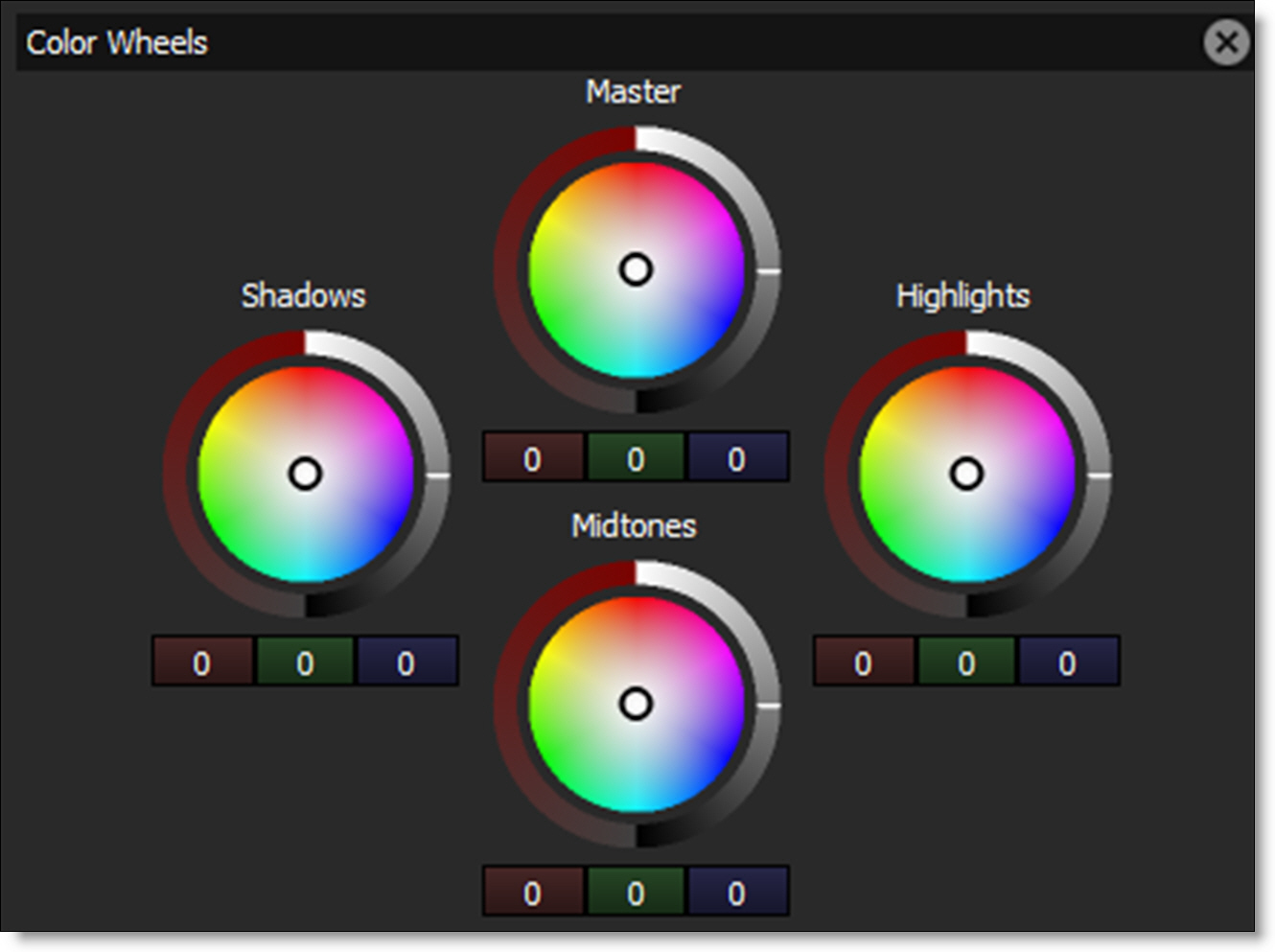 The Color Wheel window allows you to adjust the color of the brightness, hue and saturation of the master, shadows, midtones and highlights.