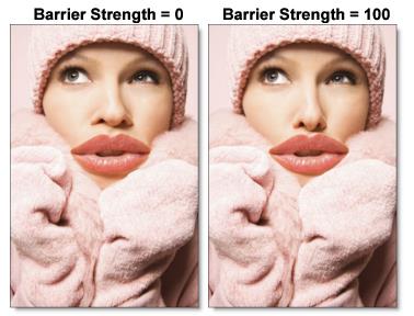 The Barrier Strength control, available only for unjoined shapes, lets barriers pass through a portion of a warp's influence. At a value of zero, the influence of the barrier shape is almost completely eliminated. At a value of 100 percent, the barrier is at 100 percent strength, and the influence of a warp stops dead. All unjoined shapes default to 100 percent.