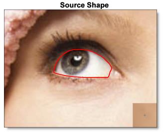 To illustrate the use of correspondence points, source and target shapes are created on two different images. The source shape is outlined in red and the target shape is outlined in blue.