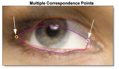The next example shows how the correspondence points are used to maintain the relationship between source and target features. In this case, correspondence points were placed in such a way as to bisect both pupils. Even though these correspondence points are not left-most or right-most or even the same distance around each eye surround, they represent logically connected features between the source and target.