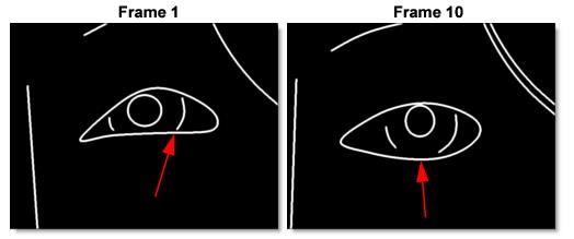 The arrows show where on the eye surround shape the iris shape connects. You can see how from frame 1 to frame 10, the place where iris meets the eye surround slides relative to the eye surround (compare to the position of the iris, for example).
