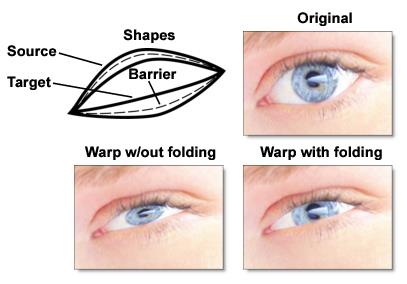 Sometimes the warping of a pair of joined shapes can overtake other shapes (joined or barrier). The overtaking shapes will necessarily fold over or under the shapes they overtake. For instance, you can warp eye lids over a pupil without distorting the pupil, as seen below.
