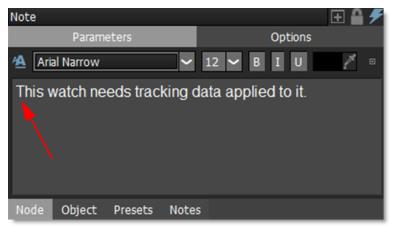 When the Note node is added to the Trees window, the cursor appears in the Note > Parameters text editor where you can type your note.