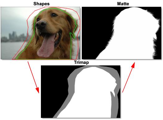 • Ideally, the unknown region, the regions not defined with foreground or background shapes, should only cover transparent pixels whose actual values are not completely foreground or background. In other words, the unknown region should include hair detail, transparent or blurry portions of the image.