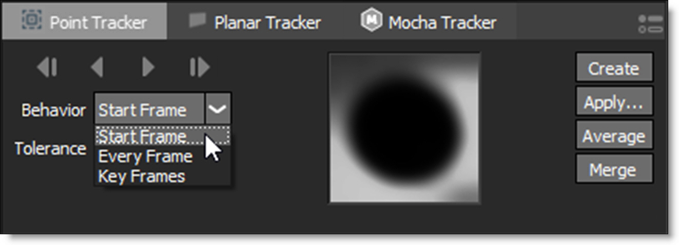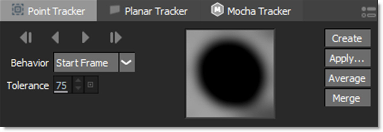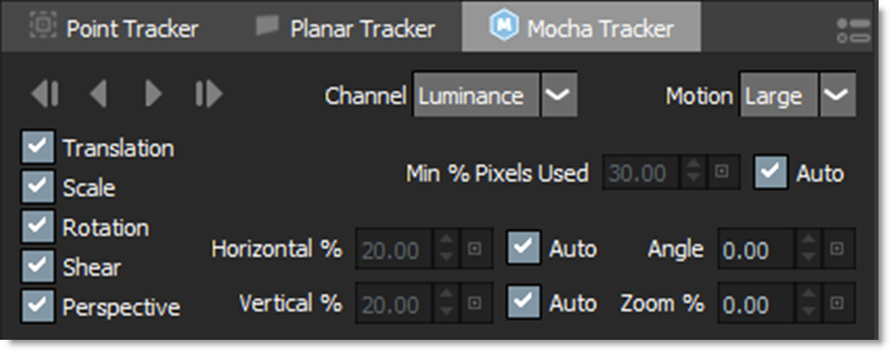 When the Tracker is selected, various non-animateable controls appear in a Tracker window located at the bottom portion of the screen. You have the choice of using either the Point Tracker, Planar Tracker or Mocha Tracker.