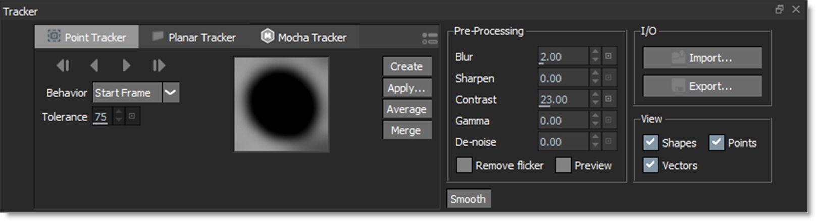 Most tracker parameters are interactively set while moving the tracker in the Viewer. When a point tracker is selected, its parameters are displayed in the Object Parameters.
