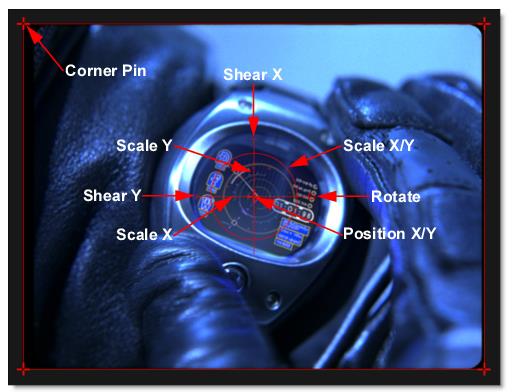 The image can be corner pinned by adjusting the Corner-Pin values as well as dragging the four points on the corners of the screen.