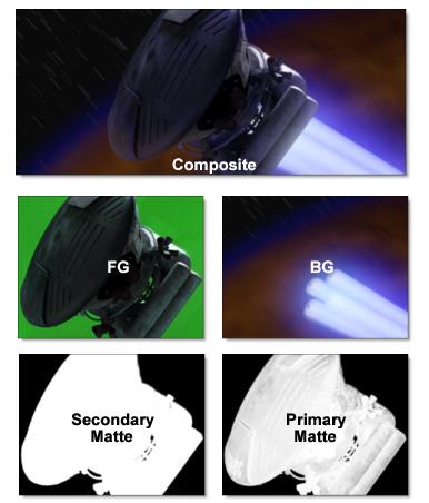 Outputs the foreground input and generated matte. Use this option if you plan to do further work on the RGB and alpha channels downstream from zMatte.