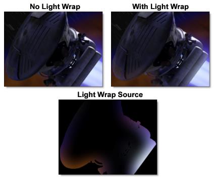 This is accomplished by placing the background layer into a special matte and then combining it with the foreground. You can look at the Light Wrap element in the View menu.