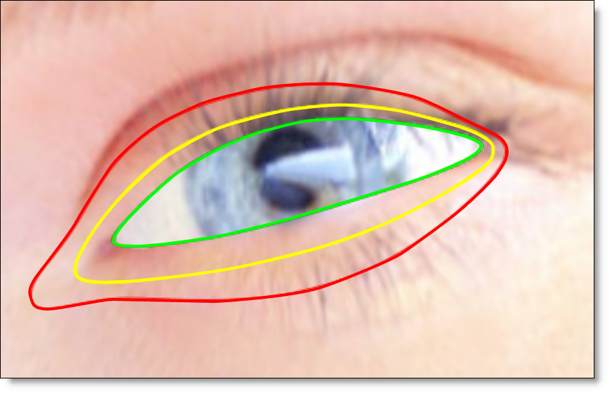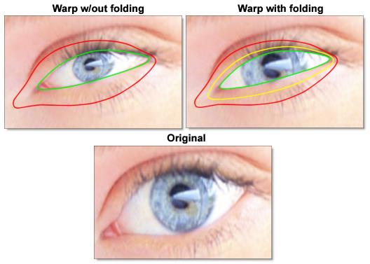 Sometimes the warping of a pair of joined shapes can overtake other shapes (joined or barrier). The overtaking shapes will necessarily fold over or under the shapes they overtake. For instance, you can warp eye lids over a pupil without distorting the pupil, as seen below.