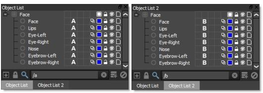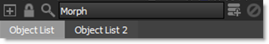 The Object Lists are identical until you filter them with the Search icon. With two Object Lists open, for instance, you can filter one on /l (left view) and the other on /r (right view) for stereo projects or filter on /a (A side) in one and /b (B side) in the other for morphing. If you then switch an object’s view assignment from left to right or from A to B, it will cause it to jump between the two lists.