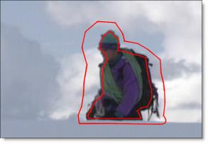 6 Now, draw closed shapes to define background area (what you want to get rid of). If your foreground object is completely surrounded by background, like the hiker example below, a quick way to define the background area is to first draw a closed shape around the outside of the foreground and then invert it in the Object window. The areas outside of the background shape are then considered as background.