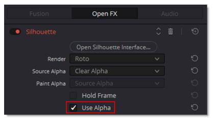 Note: When Silhouette is applied in the Edit tab, only one input can be used. An optional source can only be input into Silhouette through the Resolve > Color tab.